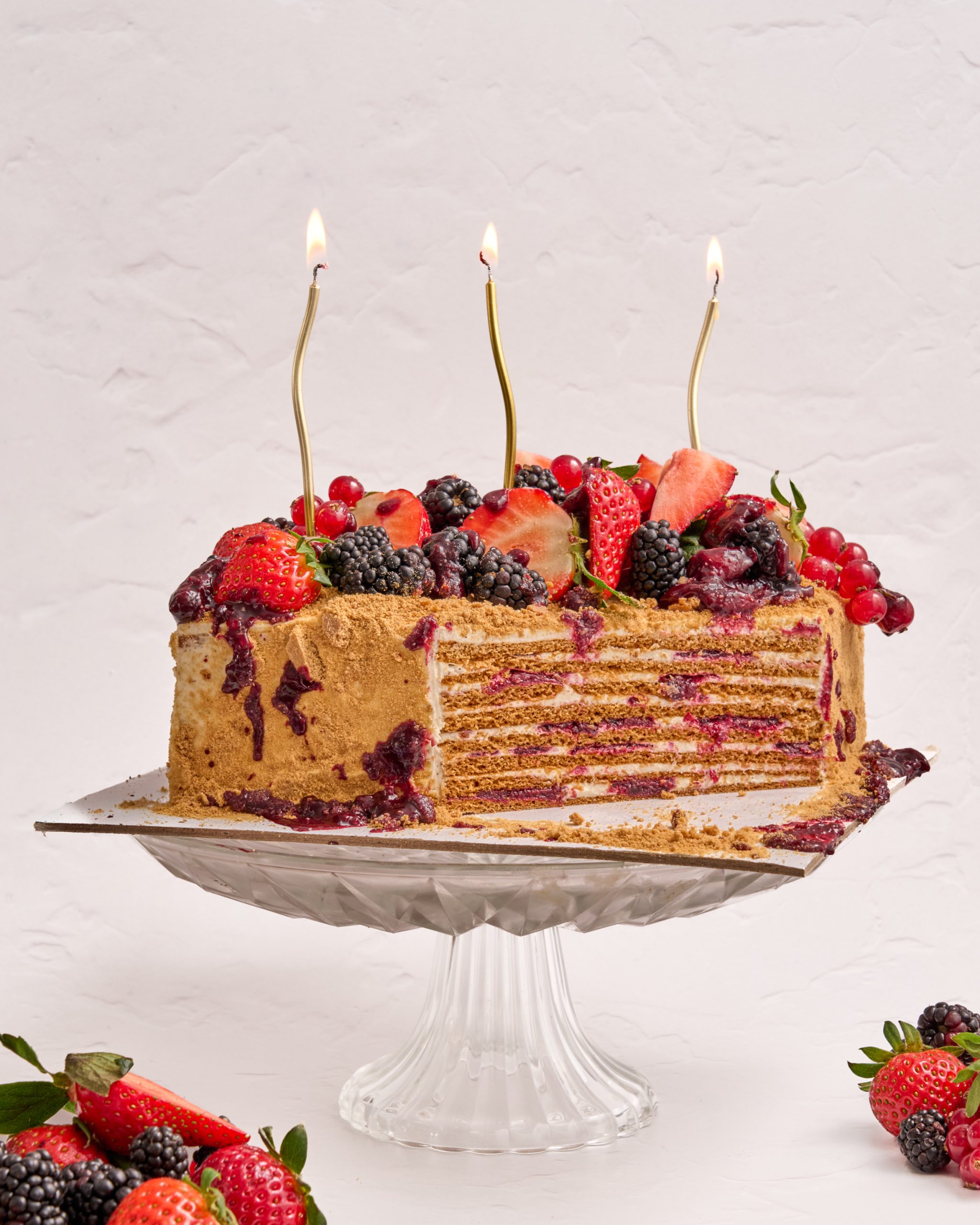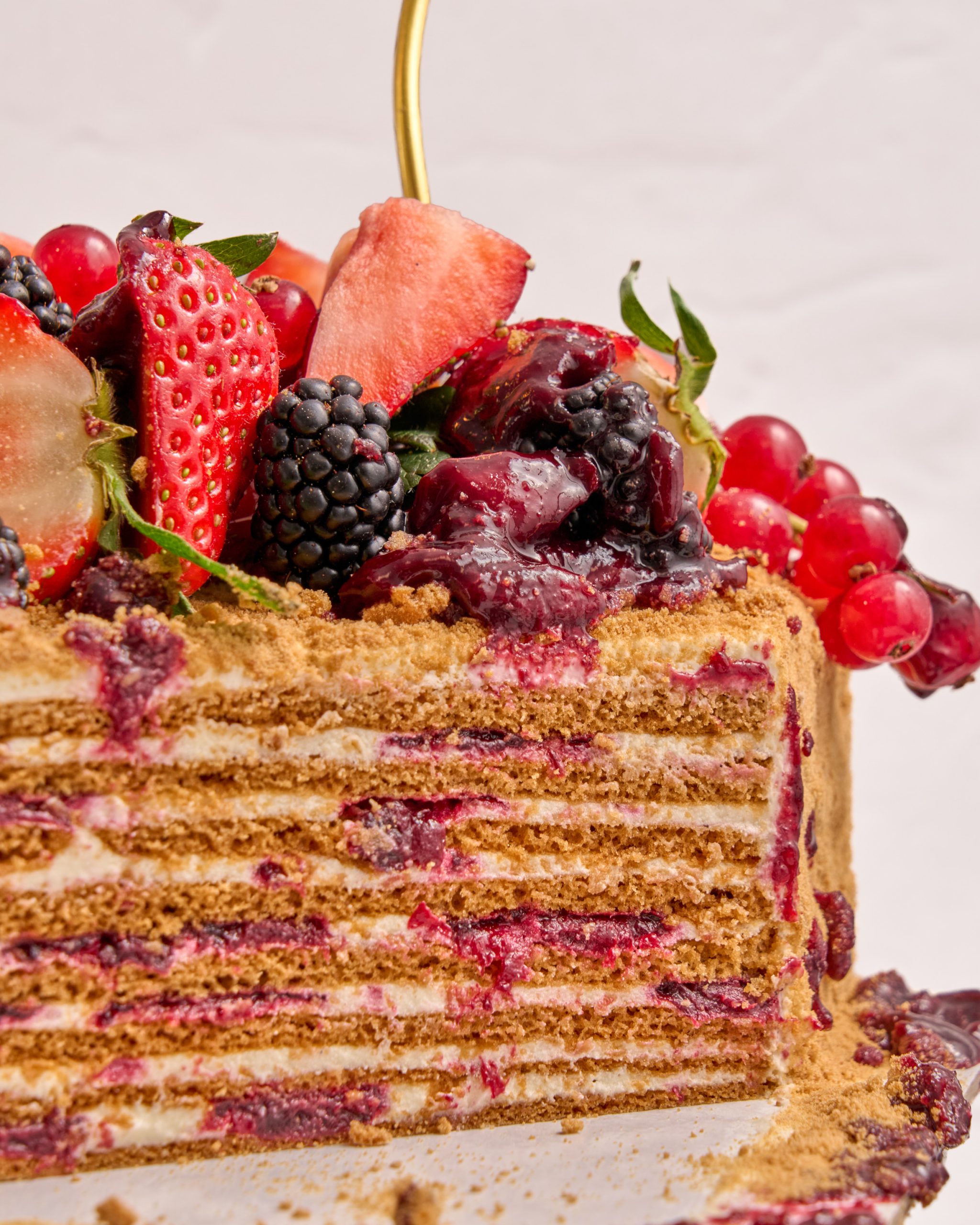 Foile subțiri cu miere, ușor caramelizate și pline de aromă, se îmbină armonios cu o cremă de smântână și vanilie, care le pătrunde și le transformă într-o textură fragedă și cremoasă. Printre straturi, reducția de vișine adaugă accente vibrante, ușor acrișoare, care temperează dulceața și oferă un contrast plăcut la fiecare îmbucătură.